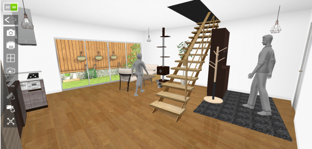 なお、前回の記事の「部屋タイプを設定・変更する」の最後でも説明しましたが、こちらのカリモク家具3Dシミュレーターは1階しか作れない仕様なので階段を設置することは可能ですが2階へ上がったりは出来ませんのでご注意ください。